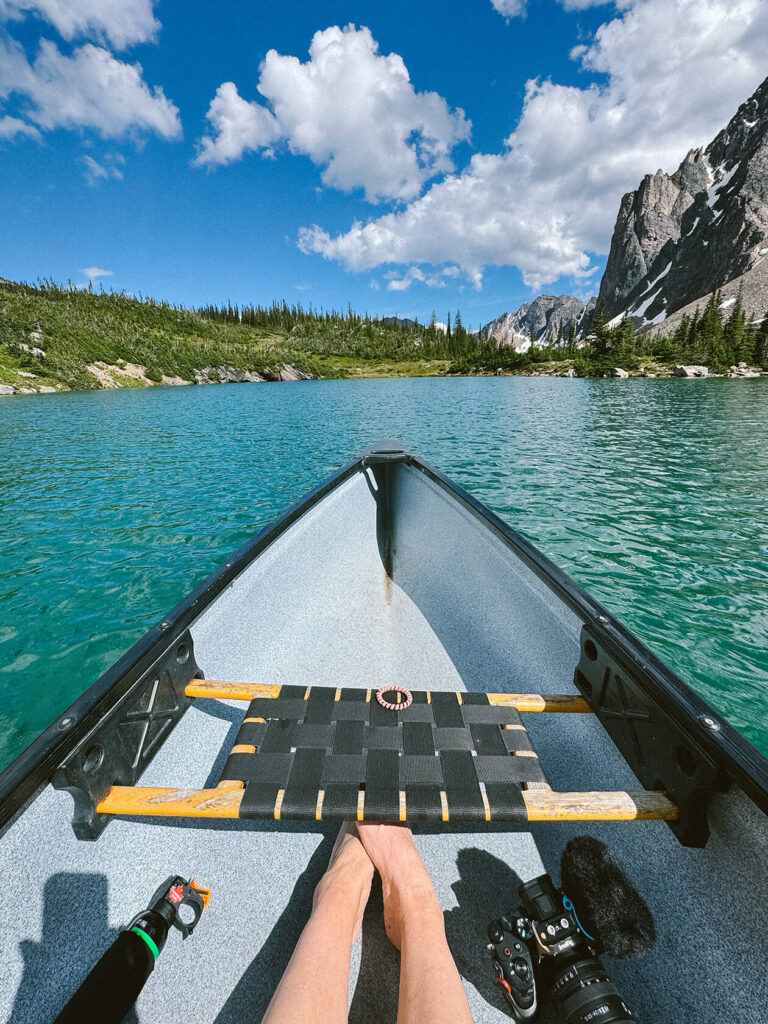 The real surprise, though, is waiting on the shoreline — a free canoe ready for anyone to paddle out and take in the scenery from the water. Why is there a canoe at 2,000 metres? The word is that one of the locals brings it up behind their snowmobile in the winter for everyone to enjoy. What a legend!